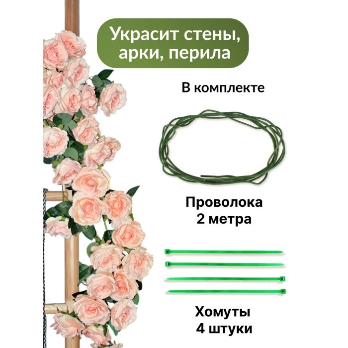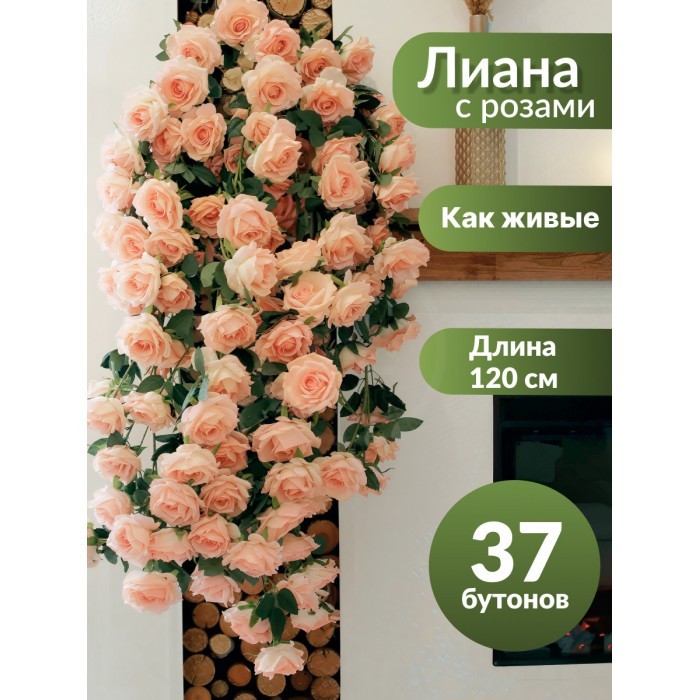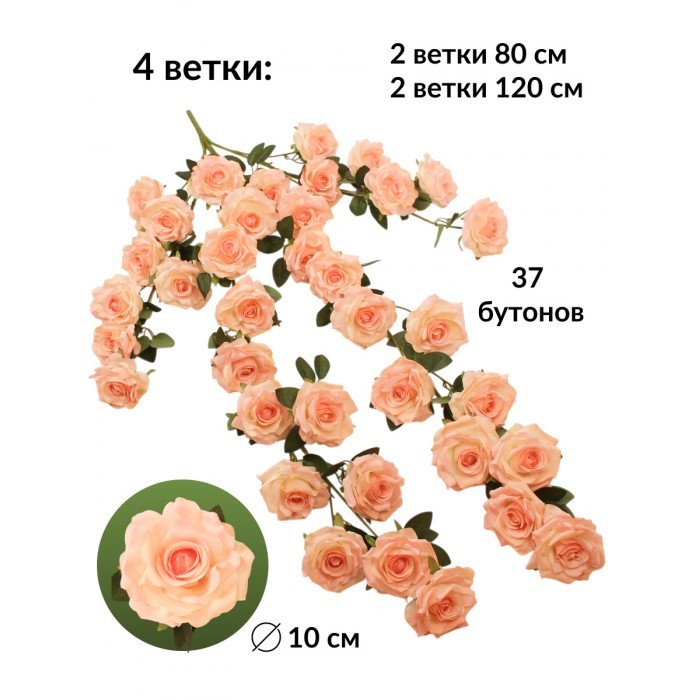 Цветы искуственные Розы каскадные (37 штук, 120 см, цветок 10 см) розовый теплый 265454