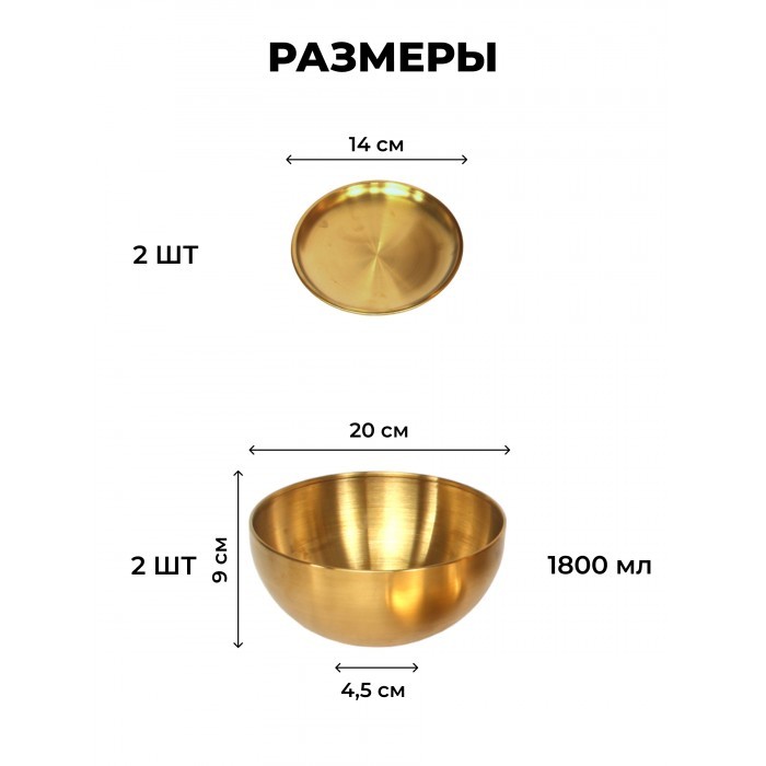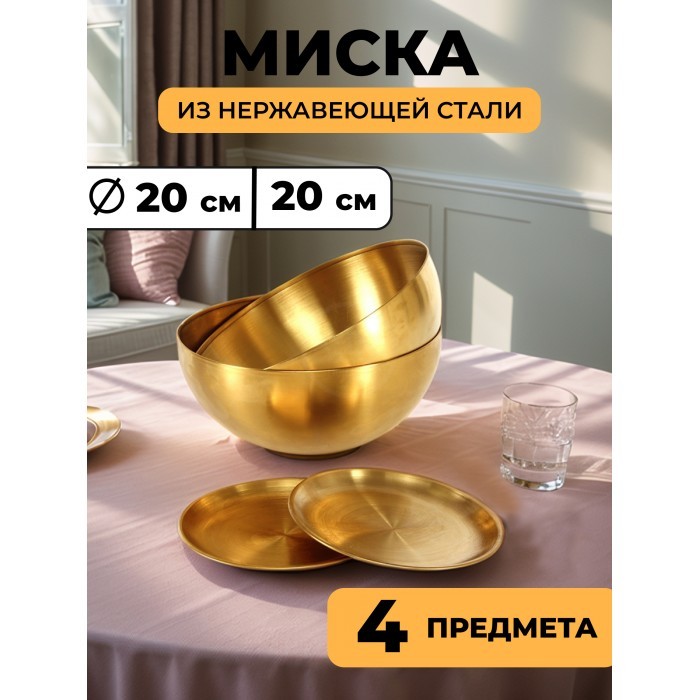 Набор Мисок из нержавеющей стали 4пред (20см-2шт+блюдце 14 см-2шт) золото 262429
