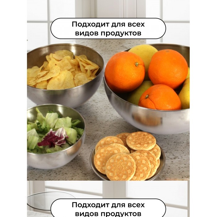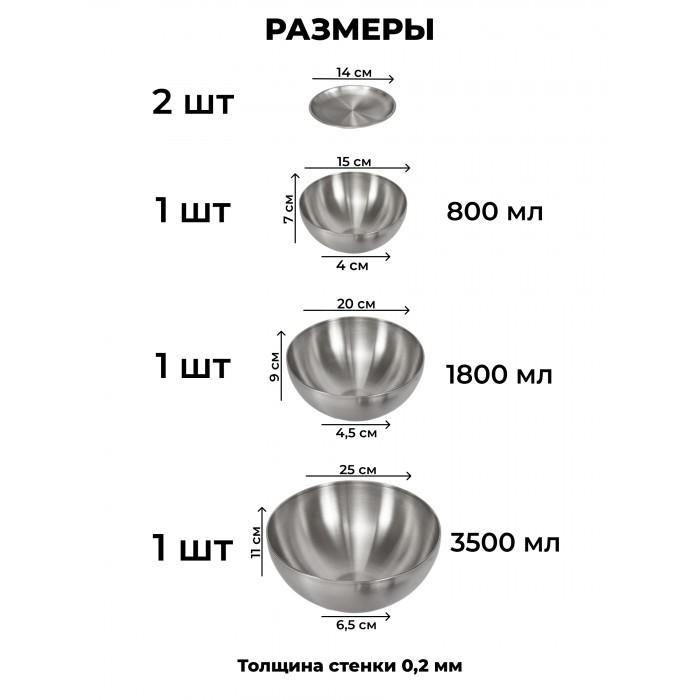 Набор Мисок из нержавеющей стали 5пред (15см, 20см, 25см-по 1шт+блюдце 14см - 2шт) серебро 263333