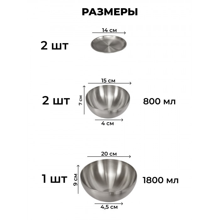 Набор Мисок из нержавеющей стали 5пред (15см- 2шт+20см-1шт +блюдце 14см-2шт) серебро 263334