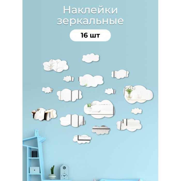 Интерьерные зеркальные наклейки Облака -16-шт (19*12/16*8/11*5, 5/6, 5*3, 5) серебро 265973