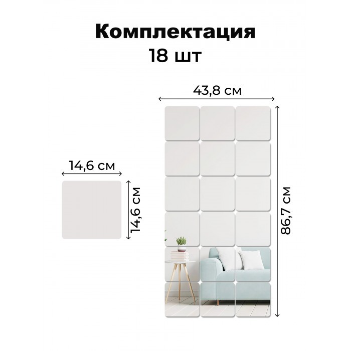 Интерьерные зеркальные наклейки Квадрат 18 шт ( 15*15 см, толщина 1мм) скругленные углы 265990